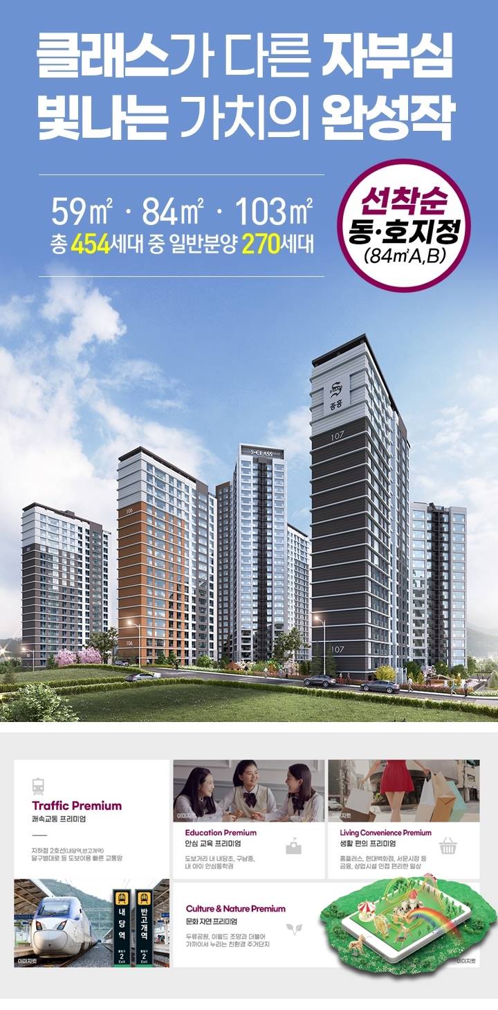 두류역 초역세권의 압도적 입지 내당역과 두류역을 동시에 누리는 더블 역세권의 가치 대구 지하철 2호선 두류역과 내당역이 인접하여 대구 전역으로 빠르게 이동할 수 있는 최상의 교통 접근성을 자랑합니다. 두류공원을 품은 쾌적한 에코 라이프 대구 최대 규모의 두류공원을 앞마당처럼 누리는 숲세권 단지 인근 대형 공원이 위치하여 도심 속에서 자연의 여유를 만끽할 수 있는 힐링 주거 환경을 제공합니다. 중흥S클래스의 혁신 평면 설계 공간의 효율성을 극대화한 4베이 구조와 남향 위주 배치 중흥건설의 노하우가 집약된 특화 설계로 채광과 통풍이 우수하며 넉넉한 수납 공간까지 확보하였습니다. 풍부한 도심 인프라의 편리함 대형 마트와 백화점 및 행정 시설이 밀집된 완성된 인프라 단지 주변에 생활 편의시설이 모두 갖춰져 있어 입주 즉시 원스톱 라이프가 가능한 완벽한 정주 여건을 갖췄습니다. 미래 가치가 기대되는 주거 타운 두류역 일대 대규모 정비사업을 통한 신 주거 중심지 도약 지속적인 개발 호재와 정비사업을 통해 향후 대구를 대표하는 고품격 주거 타운으로서의 높은 프리미엄이 기대됩니다. 프리미엄 모델하우스 방문 안내 사전 예약으로 대기 없이 진행되는 상세한 분양 상담 모델하우스 방문을 통해 실제 유니트를 직접 확인하고 전문 상담사의 상세한 안내를 받으실 수 있습니다.